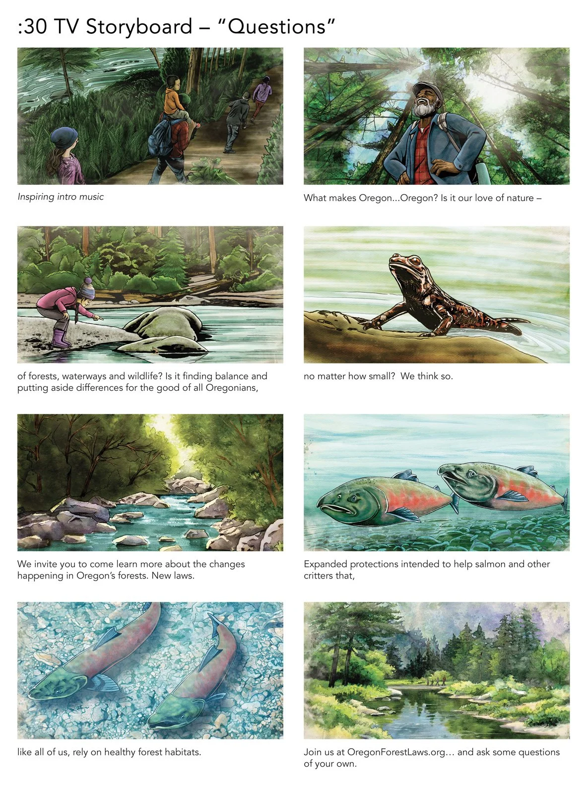 I worked with Gard Communications and client Oregon Forest Resources Institute (OFRI) on a few different projects. The black and white storyboard was used for internal review, and the more detailed color versions were used for animatics in focus group testing.